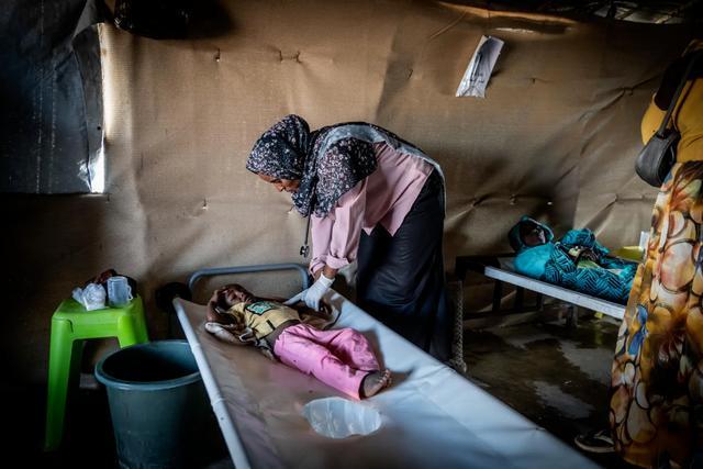 苏丹的一个流离失所者营地中,MSF(无国界医生)霍乱诊所的 Dr. Omnayat El Toom 正在为一名患有霍乱的儿童患者进行治疗/图源:联合国人道主义事务协调厅